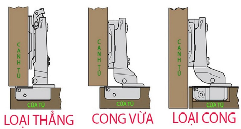 Khi chọn bản lề bật giảm chấn, các bạn lưu ý đến 3 loại như sau, tùy thuộc vào vị trí giữa cánh tủ và cạnh tủ như sau: