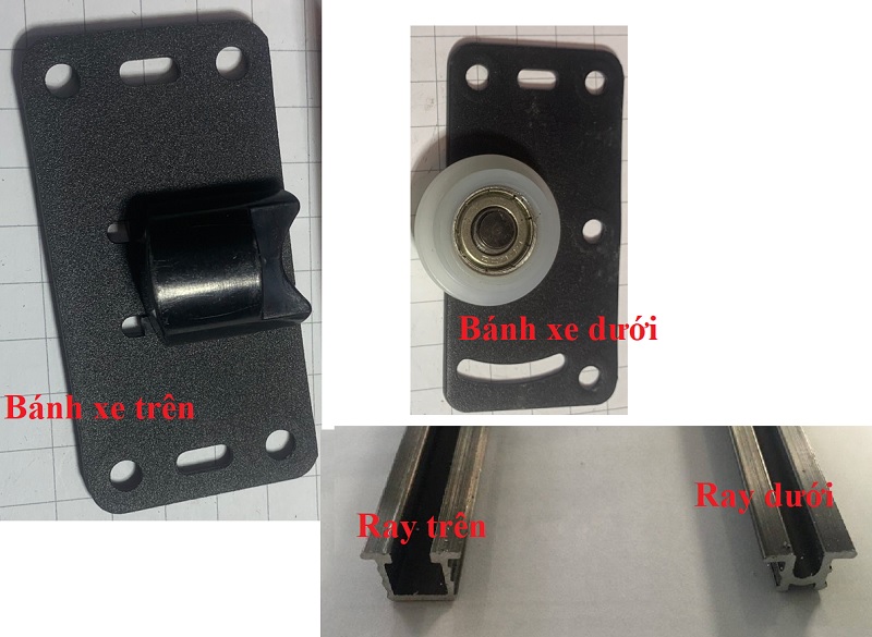 Bộ sản phầm đầy đủ bao gồm: Bánh xe trên (loại tự làm sạch, không con lăn); Bánh xe dưới; Ray Dưới; Ray Trên. chi tiết như ảnh dưới đây: