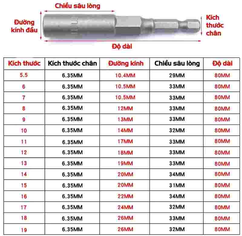 - Kích cỡ đa dạng: 6mm, 7mm, 8mm, 9mm, 10mm, 11mm, 12mm, 13mm, 14mm, 15mm, 16mm, 17mm, 18mm, 19mm