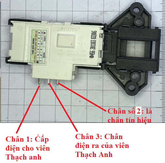 - Khi máy giặt song: Bo mạch ngừng cấp điện đến chân 1 và 3 => Viên Thạch anh không có điện => co về => mở chốt => mở được bằng tay.