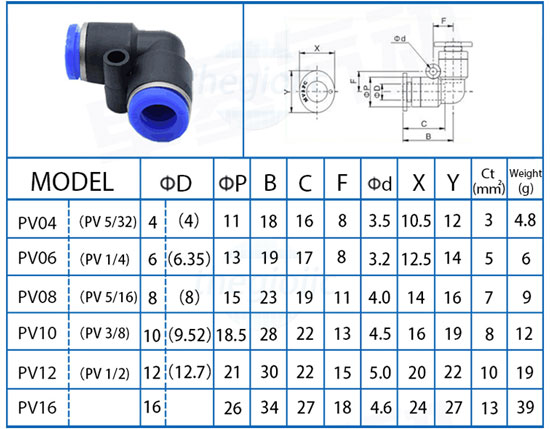 Bảng thông số đầu Cút nối ống khí nén 10 - 10