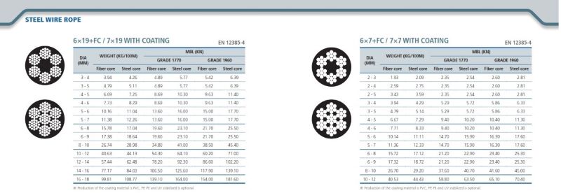 - Quy cách sản xuất sợi: 6×12+FC ( nghĩa là 6 bó, mỗi bó có 12 sợi và 1 lõi lụa FC ở giữa), 7×19 WHITCOATING (Có 7 bó, mỗi bó có 19 sợi trong đó 6 bó xung quanh và 1 bó ở giữa)