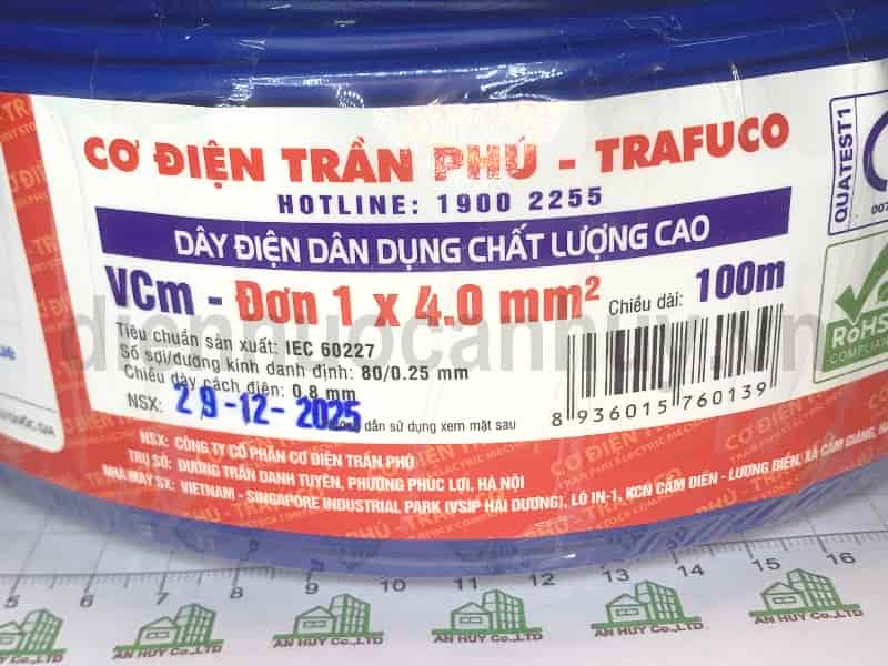 Dây 1x4.0 là loại dây đơn, tiết diện lõi đồng là 4 mm2 tương đương với đường kính là 2.26 mm