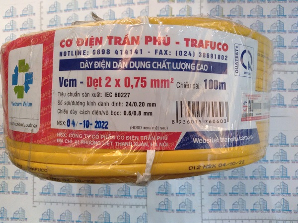 Dây đôi trần phú 2x0.75 mầu vỏ bên ngoài mầu vàng, lớp dây đôi bên trong có 4 loại mầu: mầu đỏ, mầu xanh, mầu trằng hoặc mầu đen
