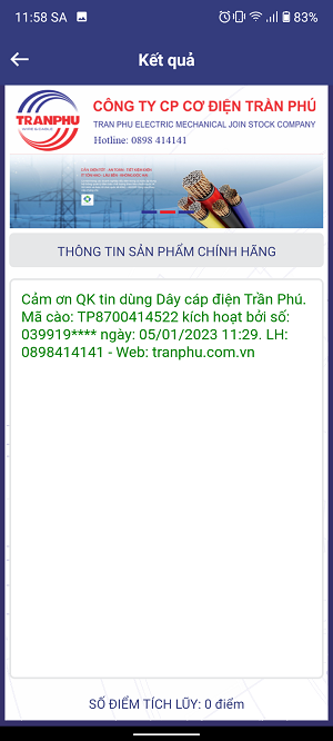 Đối chiếu mã tích điểm trong tin nhắn với mã tích điểm ở nửa còn lại của tem kiểm tra hàng chính hãng trên cuận dây điện trùng nhau là ok.