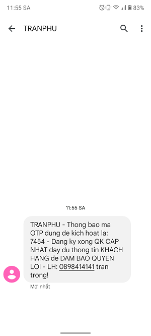 Bước 4: Nhập mã OTP từ tin nhắn Trần Phú gửi về.