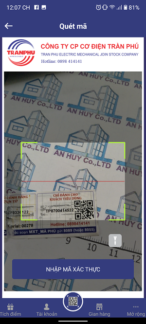 trong giao diện của áp có mục quyét mã QR code, nhấn vào đó và đưa điện thoại đến mã QR code ở phía bên phải của tem "Chỉ dành cho khách tiêu dùng"