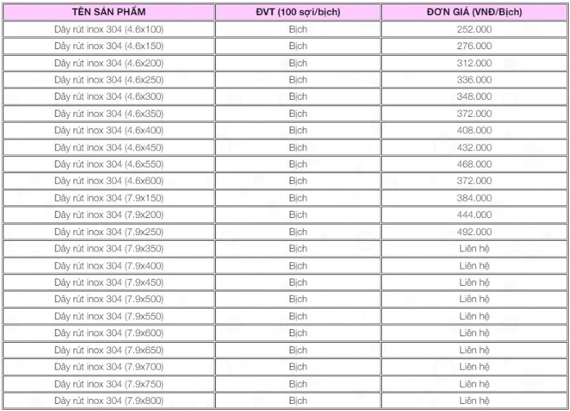 Bảng giá dây rút inox