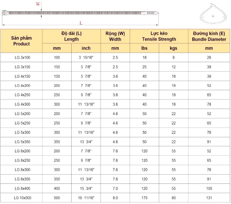 Bảng thông số dây rút nhựa