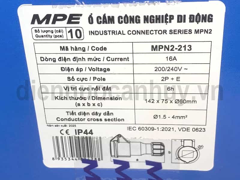 MPE ổ cắm công nghiệp 3 lỗ IP44 16A 2P+E MPN2-213