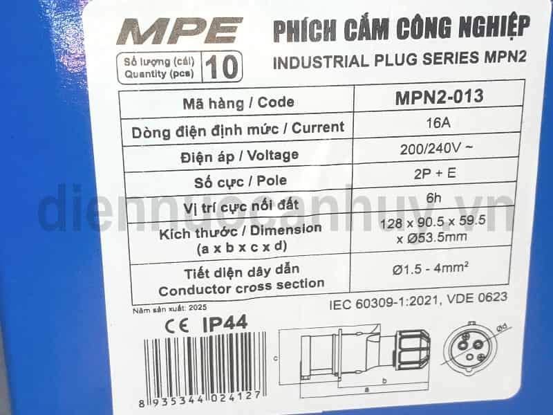 MPE phích cắm công nghiệp 3 chấu IP44 16A 2P+E MPN2-013