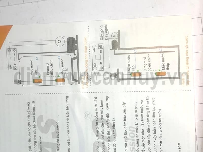 - Cách đấu dây cho trường hợp cấp nước: Nối dây nguội trực tiếp vào máy bơm. Nối dây nóng vào các đầu A1 và A2 của hộp điều khiển.