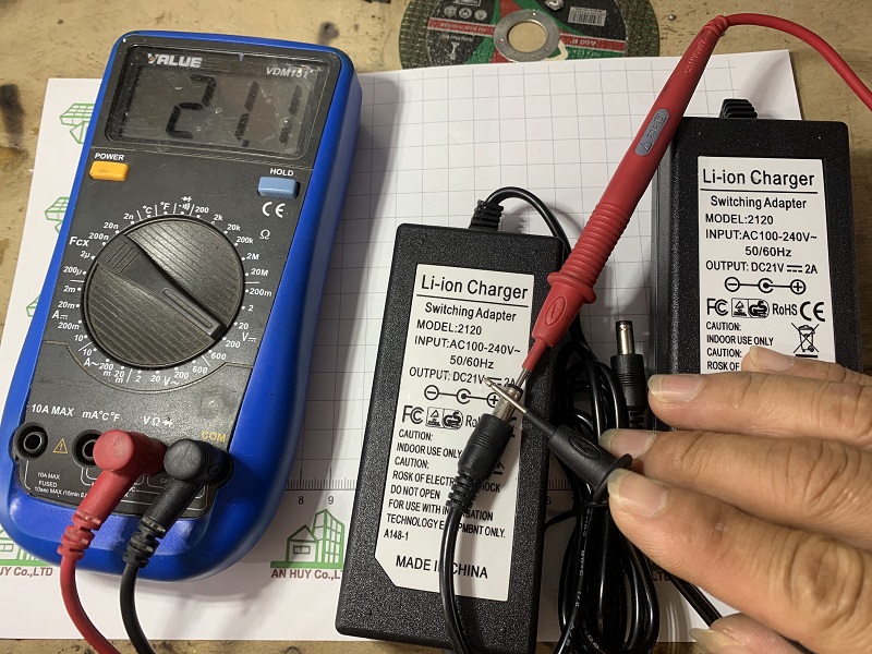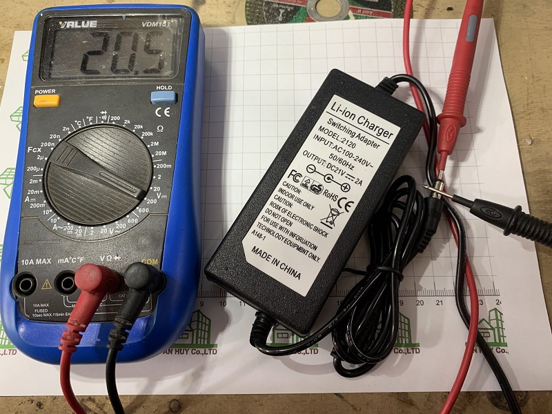 Củ sạc adapter cho máy khoan pin 21V bị hỏng, vì điện áp để sạc cho khối pin là 21v nhưng đo thực tế chỉ được gần 21V như vậy bạn chỉ có thể sạc tạm thời chứ không thể sạc đầy pin với củ sạc này được.