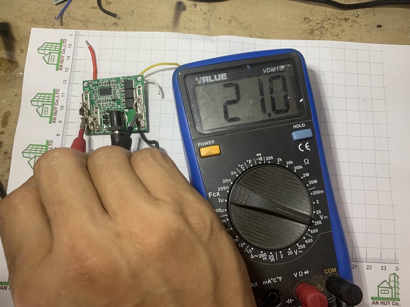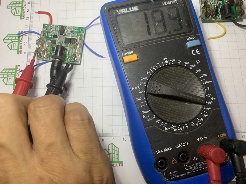 Trường hợp này, điện áp đo được giữa hai chân ra tải chỉ là 18.9V vì vậy Pin máy khoan sạc không vào điện, mạch hỏng!