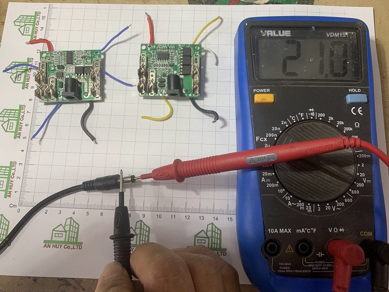 Trên mạch sạc cân bằng thường có 3 khe cắm pin vào máy khoan. Hai khe ngoài cùng là vào động cơ máy khoan, chân ở giữa là chân dương (hoặc chân âm) của củ sạc. Khi đo kiểm, ta cắm chân sạc vào cổng adapter của mạch sạc như trong video dưới đây và tiến hành đo. Nếu điện áp đầu ra giữa hai chân ngoài cùng không đạt được điện áp sạc đầy như ở bước 3 thì mạch hỏng. Hoặc nếu điện áp đầu ra ở hai cực sạc không bằng hoặc vượt quá điện áp sạc thì cũng hỏng.