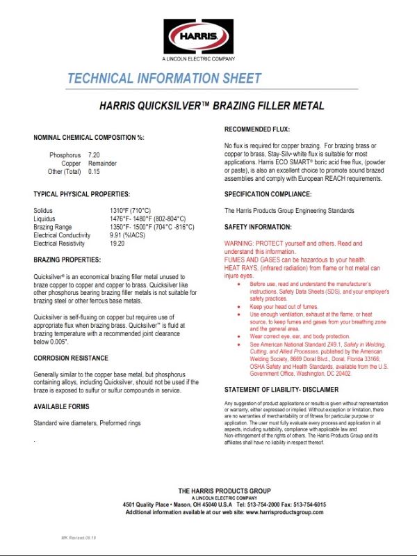 bảng thông số kỹ thuật của que hàn đồng harris 0
