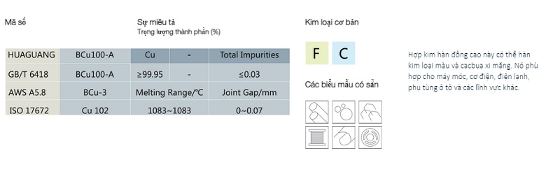 - Que hàn đồng huaguang trung quốc: Với thành phần trên 99.9% là đồng nguyên chất, Que hàn đồng trung quốc huaguang ứng dụng trong việc hàn ống đồng điều hòa, ngoài ra loại này rất khó để hàn đồng thau với nhau.